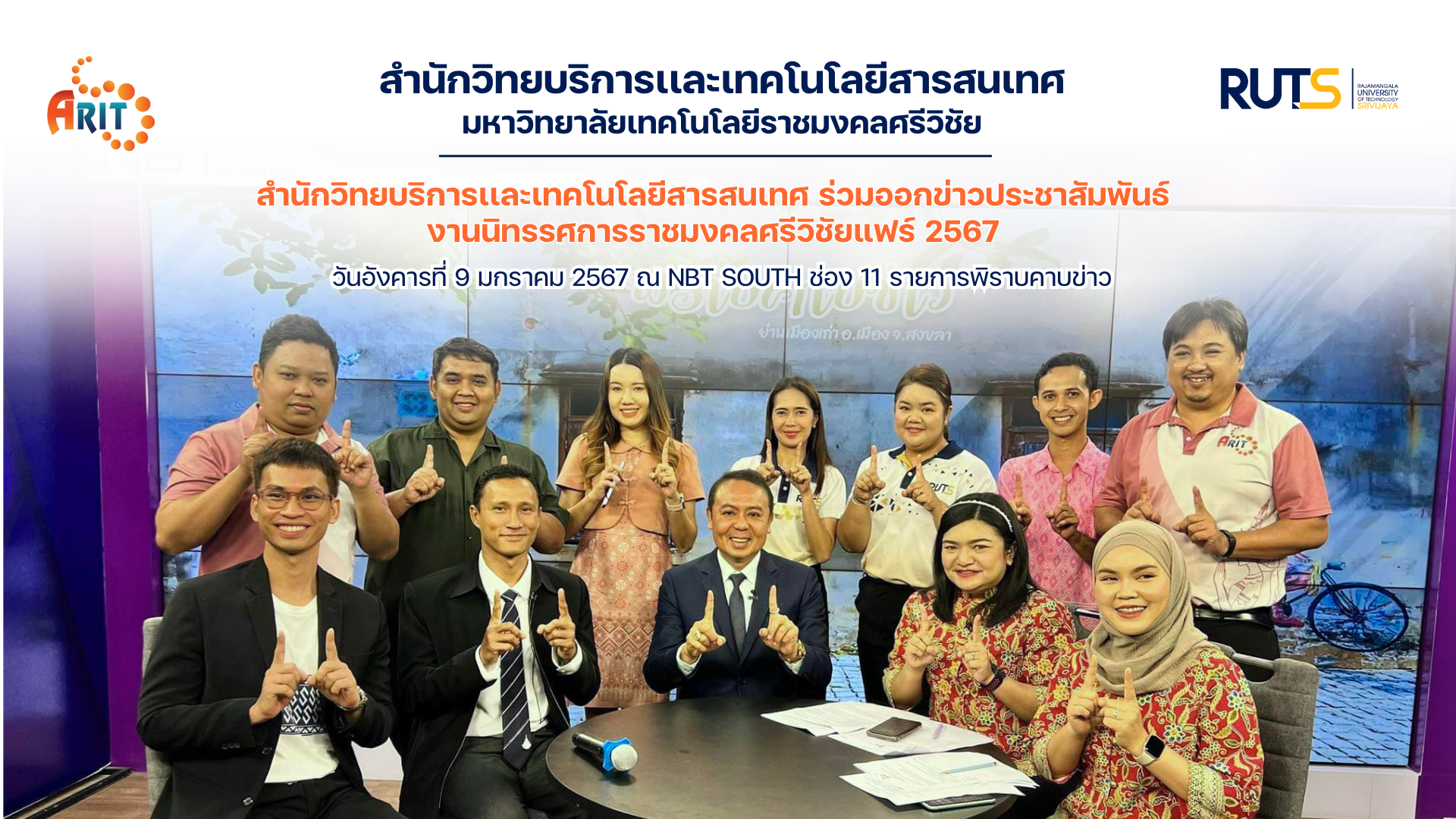วันที่ 9 มกราคม 2567 เวลา 08.30 น. ผู้ช่วยศาสตราจารย์สิทธิโชค อุ่นแก้ว ผู้อำนวยการสำนักวิทยบริการและเทคโนโลยีสารสนเทศ ได้รับมอบหมายจาก ผู้ช่วยศาสตราจารย์ปิยะ ประสงค์จันทร์ ร่วมออกข่าวประชาสัมพันธ์ การจัดงานนิทรรศการศรีวิชัยแฟร์ 2567 นิทรรศการรูปแบบเสมือน (Virtual Exhibition) ที่จะจัดขึ้นระหว่างวันที่ 15 – 19 มกราคม 2567 ออกอากาศช่อง 11 NBT SOUTH รายการพิราบคาบข่าว พร้อมทีมผู้พัฒนา เพื่ออธิบายที่มาของการจัดงานนิทรรศการศรีวิชัยแฟร์ 2567 แบบนิทรรศการเสมือน (Virtual Exhibition) เเละขั้นตอนการเข้าร่วมนิทรรศการผ่านการเข้าชมเว็บไซต์ https://srivijayafair.rmutsv.ac.th/