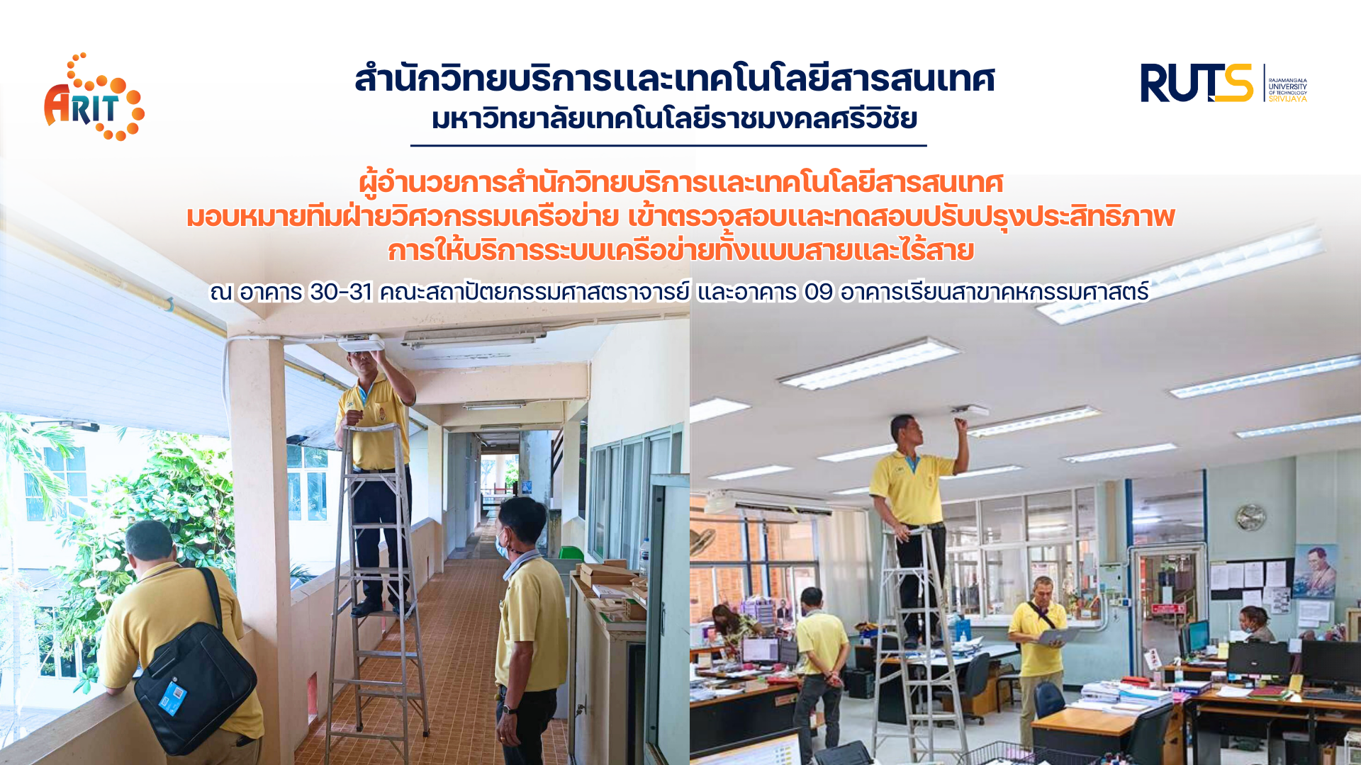 วันที่ 11 มกราคม 2567 ผู้ช่วยศาสตราจารย์สิทธิโชค อุ่นแก้ว ผู้อำนวยการสำนักวิทยบริการและเทคโนโลยีสารสนเทศ มอบหมายทีมวิศวกรรมเครือข่ายเข้าตรวจสอบและทดสอบพร้อมยืนยันหมายเลขครุภัณฑ์ทั้งมหาวิทยาลัย วิทยาเขตสงขลา พื้นที่สงขลา โดยเริ่มต้น ณ อาคาร 30-31 คณะสถาปัตยกรรมศาสตราจารย์ และอาคาร 09 อาคารเรียนคหกรรมศาสตร์ เพื่อเตรียมพร้อมปรับปรุงประสิทธิภาพการให้บริการเครือข่ายทั้งแบบสายและไร้สายต่อไป