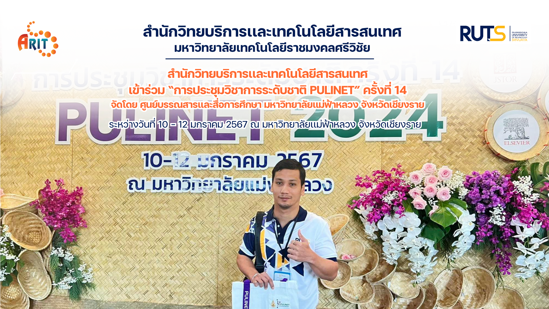 เมื่อวันที่ 10 – 12 มกราคม 2567 สำนักวิทยบริการเเละเทคโนโลยีสารสนเทศ เข้าร่วมการจัดประชุมวิชาการระดับชาติ PULINET ครั้งที่ 14 ณ มหาวิทยาลัยเเม่ฟ้าหลวง จังหวัดเชียงราย