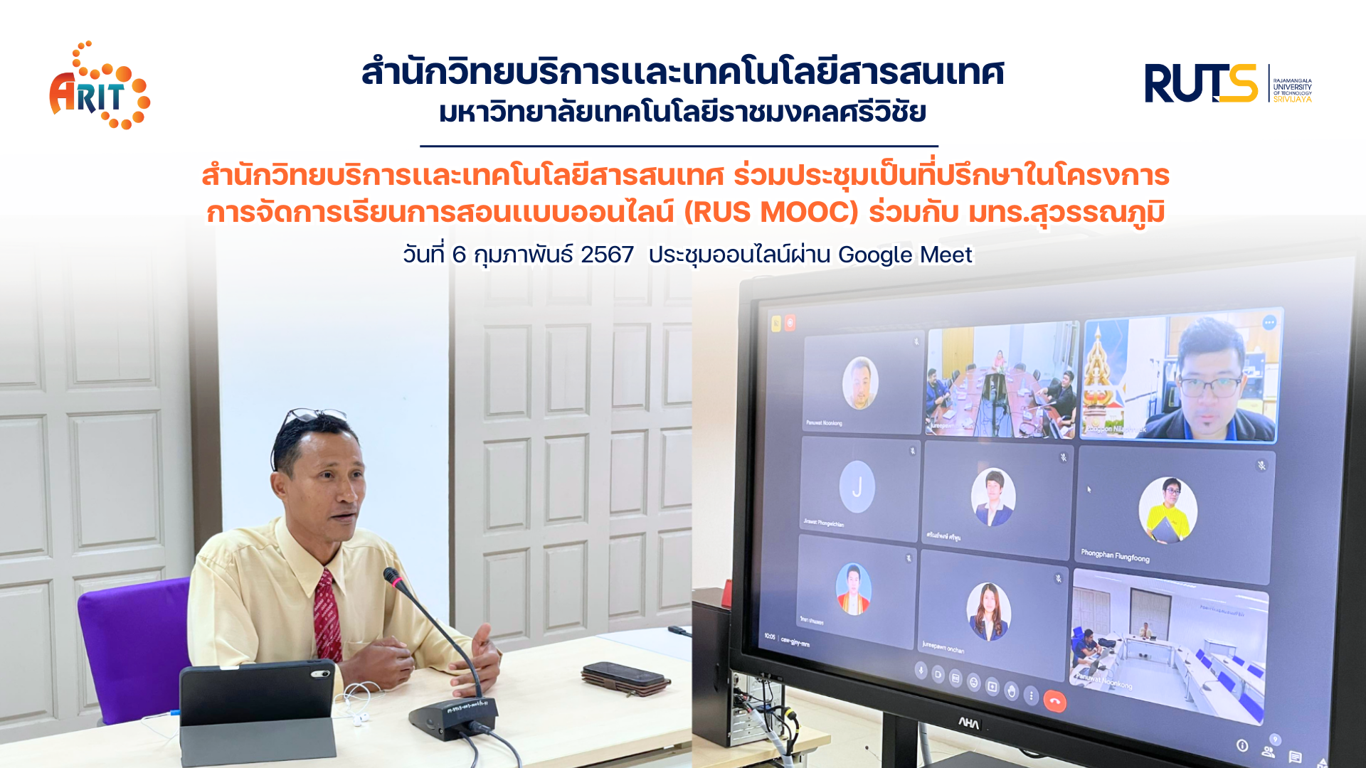 วันที่ 6 กุมภาพันธ์ 2567 เวลา 09.30 น. สำนักวิทยบริการเเละเทคโนโลยีสารสนเทศ ร่วมประชุมเป็นที่ปรึกษาในโครงการการจัดการเรียนการสอนเเบบออนไลน์ (RUS MOOC) ร่วมกับ มทร.สุวรรณภูมิ