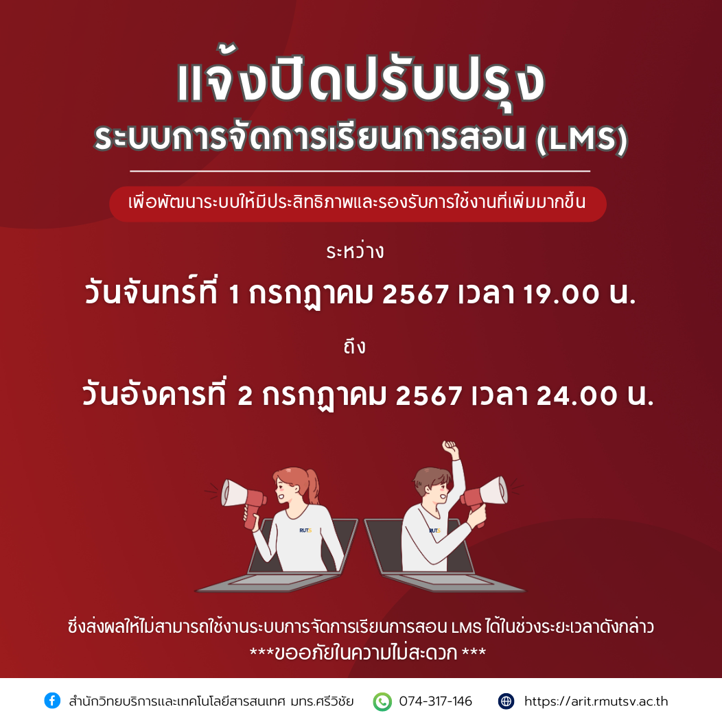สำนักวิทยบริการเเละเทคโนโลยีสารสนเทศ เเจ้งปิดปรับปรุงระบบการจัดการเรียนการสอน LMS ในระหว่างวันจันทร์ที่ 1 กรกฏาคม 2567 ตั้งเเต่เวลา 19.00 น. ถึงวันอังคารที่ 2 กรกฏาคม 2567 เวลา 24.00 น. เพื่อพัฒนาระบบให้มีประสิทธิภาพเเละรองรับการใช้งานที่เพิ่มมากขึ้น ซึ่งส่งผลให้ไม่สามารถใช้งานระบบการจัดการเรียนการสอน LMS ได้ในช่วงระยะเวลาดังกล่าว