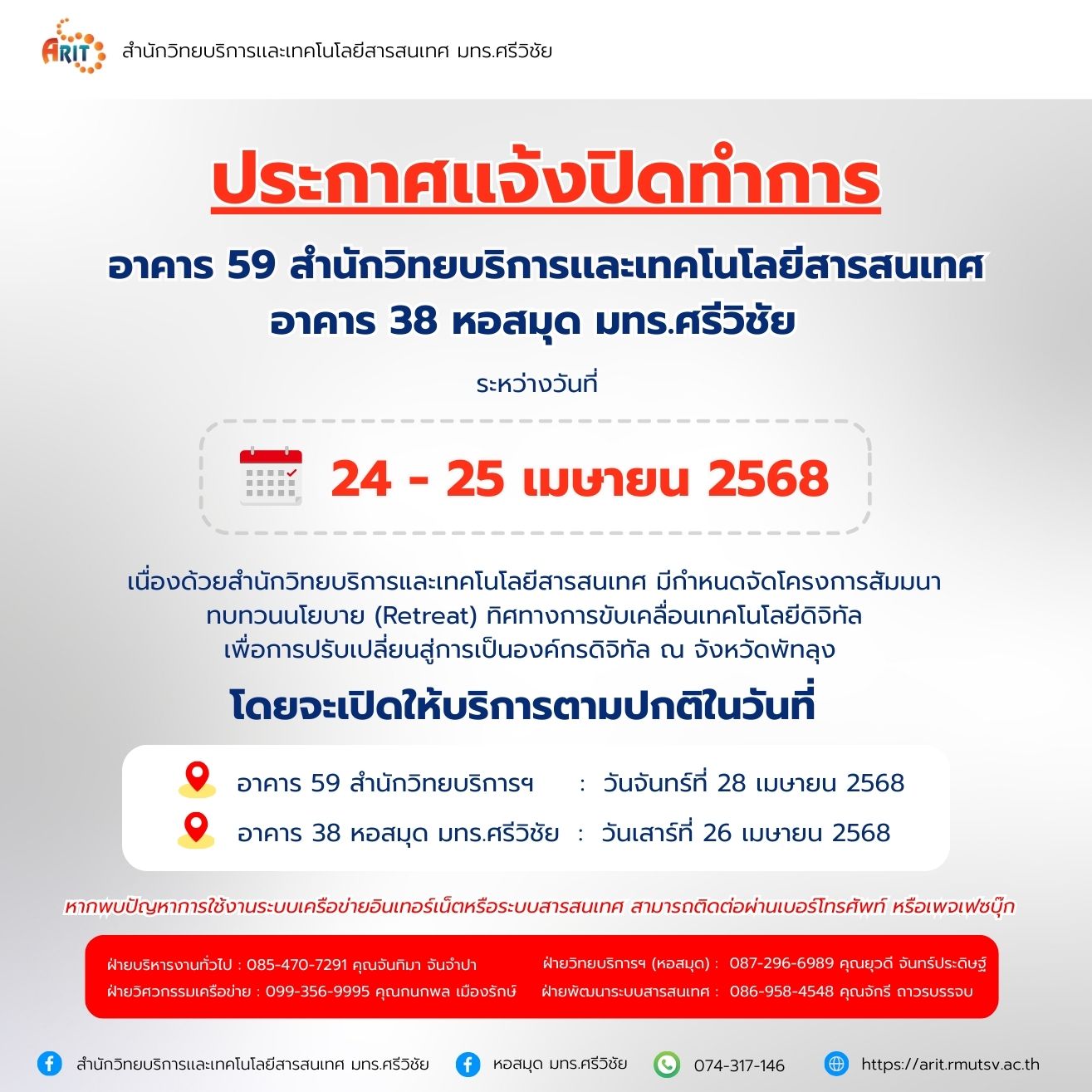 ด้วยสำนักวิทยบริการเเละเทคโนโลยีสารสนเทศ มีกำหนดจัดโครงการสัมมนาทบทวนนโยบาย (Retreat) ทิศทางการขับเคลื่อนเทคโนโลยีดิจิทัลเพื่อการปรับเปลี่ยนสู่การเป็นองค์กรดิจิทัล ณ จังหวัดพัทลุง จึงขอประกาศเเจ้งปิดทำการ อาคาร 59 สำนักวิทยบริการเเละเทคโนโลยีสารสนเทศ อาคาร 38 หอสมุด มทร.ศรีวิชัย ระหว่างวันที่ 24 – 25 เมษายน 2568
