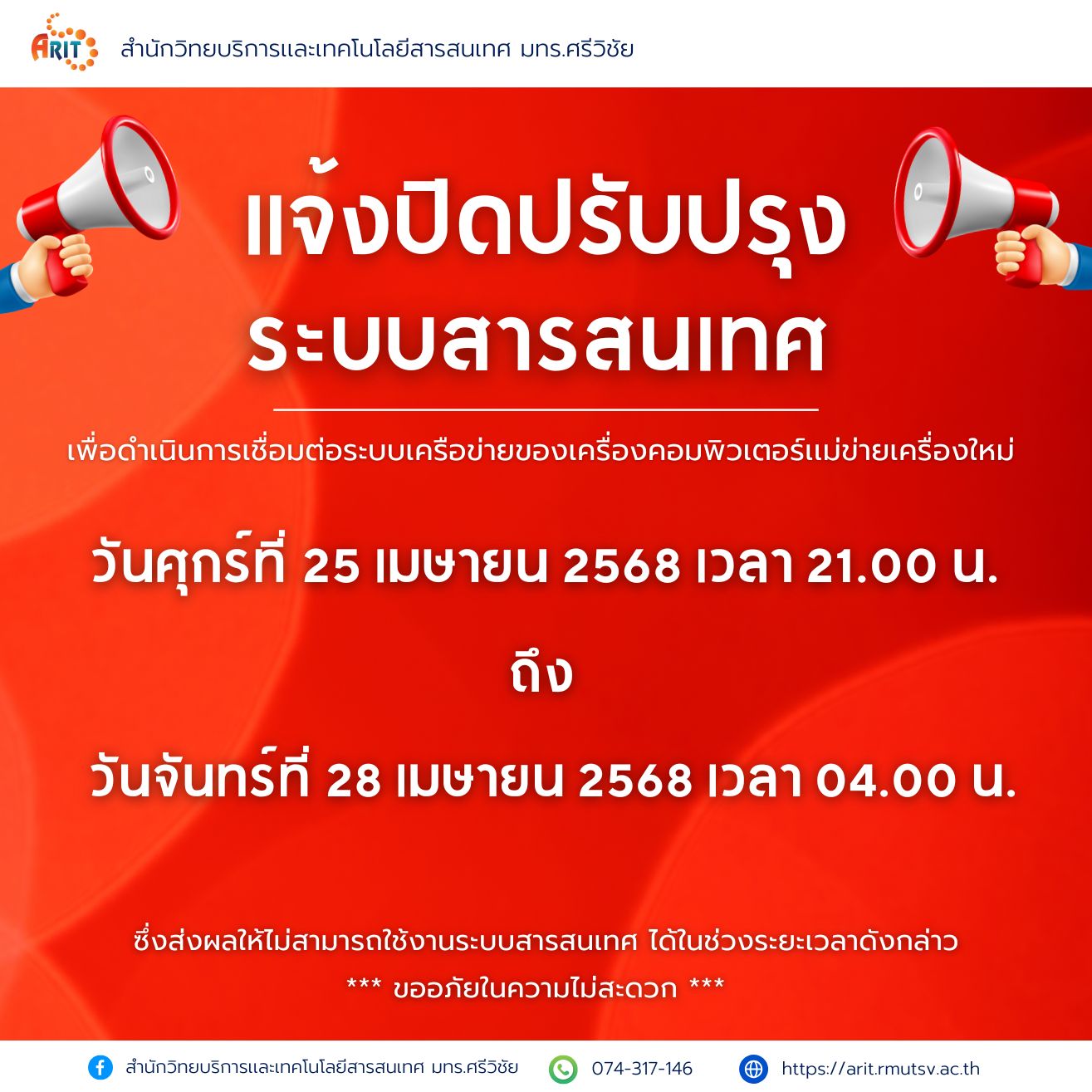 สำนักวิทยบริการเเละเทคโนโลยีสารสนเทศ จึงขอเเจ้งปิดปรับปรุงระบบสารสนเทศเพื่อทำการเชื่อมต่อระบบเครือข่ายของคอมพิวเตอร์เเม่ข่ายเครื่องใหม่ ในวันศุกร์ที่ 25 เมษายน 2568 ตั้งเเต่เวลา 21.00 น. ถึงวันจันทร์ที่ 28 เมษายน 2568 เวลา 04.00 น. ซึ่งส่งผลให้ไม่สามารถเข้าใช้งานระบบสารสนเทศของมหาวิทยาลัยได้ในช่วงระยะเวลาดังกล่าว