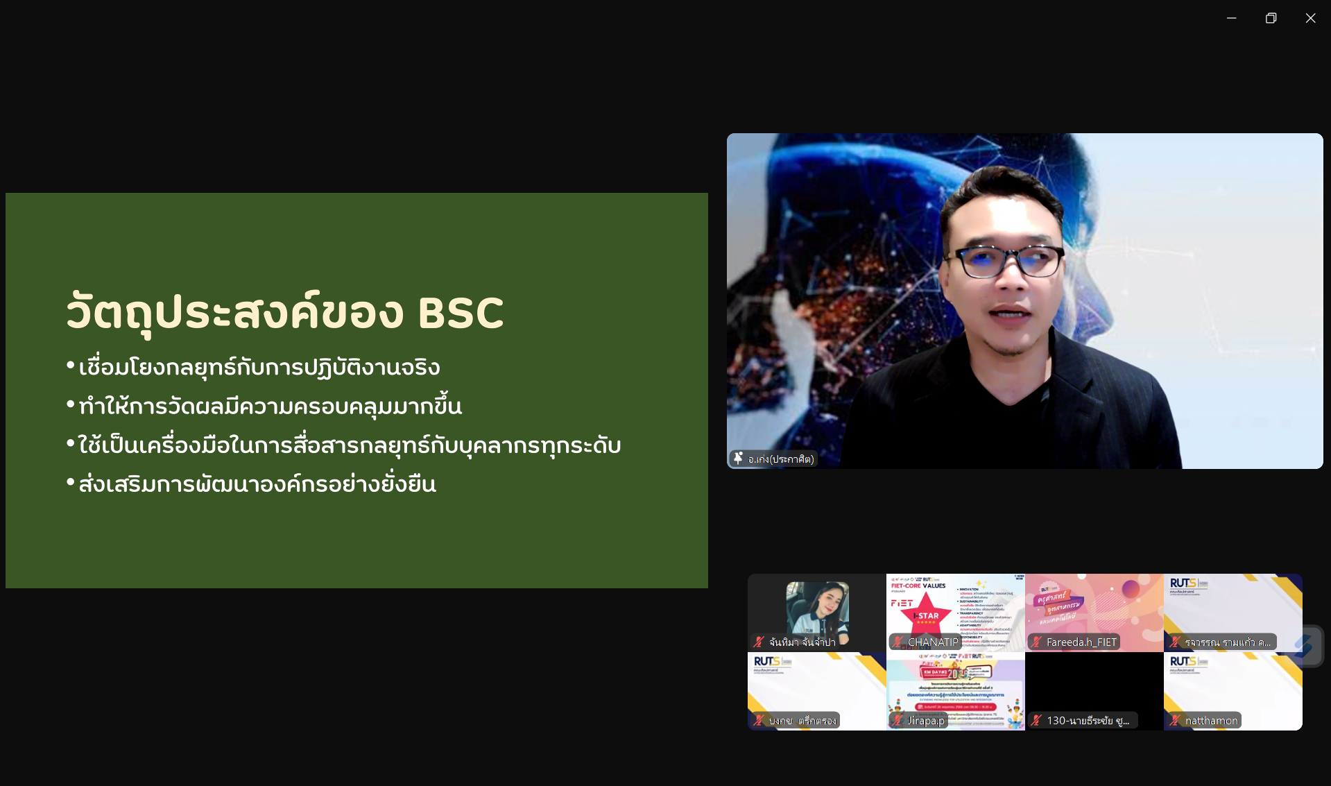 ตามที่มหาวิทยาลัยเทคโนโลยีราชมงคลศรีวิชัย ได้กำหนดเเผนการพัฒนาบุคลากรประจำปี 2568 โดยส่งเสริมให้บุคลากรผู้ปฏิบัติงานสายสนับสนุนได้รับการพัฒนาทักษะเเละเพิ่มศักยภาพในการปฏิบัติงานให้สามารถนำไปปรับใช้ได้อย่างเหมาะสมเเละมีประสิทธิภาพ สำนักวิทยบริการเเละเทคโนโลยีสารสนเทศ จึงเข้าร่วมโครงการอบรมเชิงปฏิบัติการ เรื่อง “การพัฒนาทักษะการปฏิบัติงานด้วย Balanced Scorecard” กำหนดจัดโครงการในระหว่างวันที่ 26 – 27 พฤษภาคม 2568 โดยเเบ่งออกเป็น 2 รุ่น ผ่านระบบออนไลน์ Zoom Cloud Meeting โดยได้รับเกียรติจากท่านอาจารย์สถาพร ขุนเพชร รองอธิการบดี เป็นประธานในการกล่าวเปิดโครงการฯ เเละมีวิทยากร อาจารย์ประกาศิต สพฤกษ์ศรี