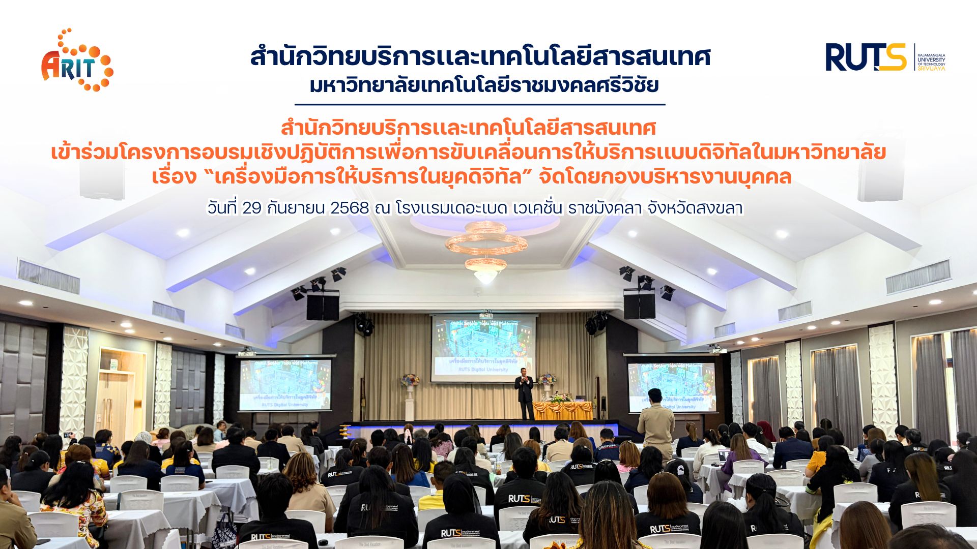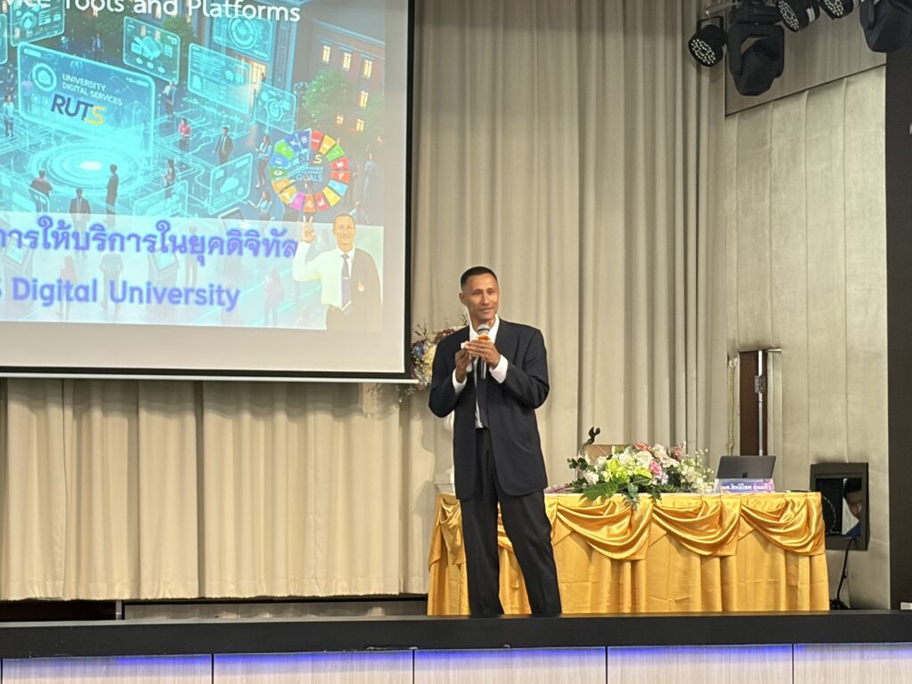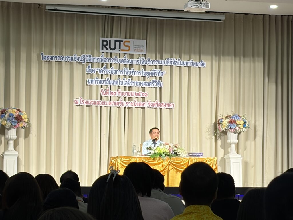 วันที่ 29 กันยายน 2568 เวลา 08.30 น. สำนักวิทยบริการและเทคโนโลยีสารสนเทศ มหาวิทยาลัยเทคโนโลยีราชมงคลศรีวิชัย เข้าร่วมโครงการอบรมเชิงปฏิบัติการเพื่อการขับเคลื่อนการให้บริการแบบดิจิทัลในมหาวิทยาลัย เรื่อง “เครื่องมือการให้บริการในยุคดิจิทัล” จัดโดยกองบริหารงานบุคคล
