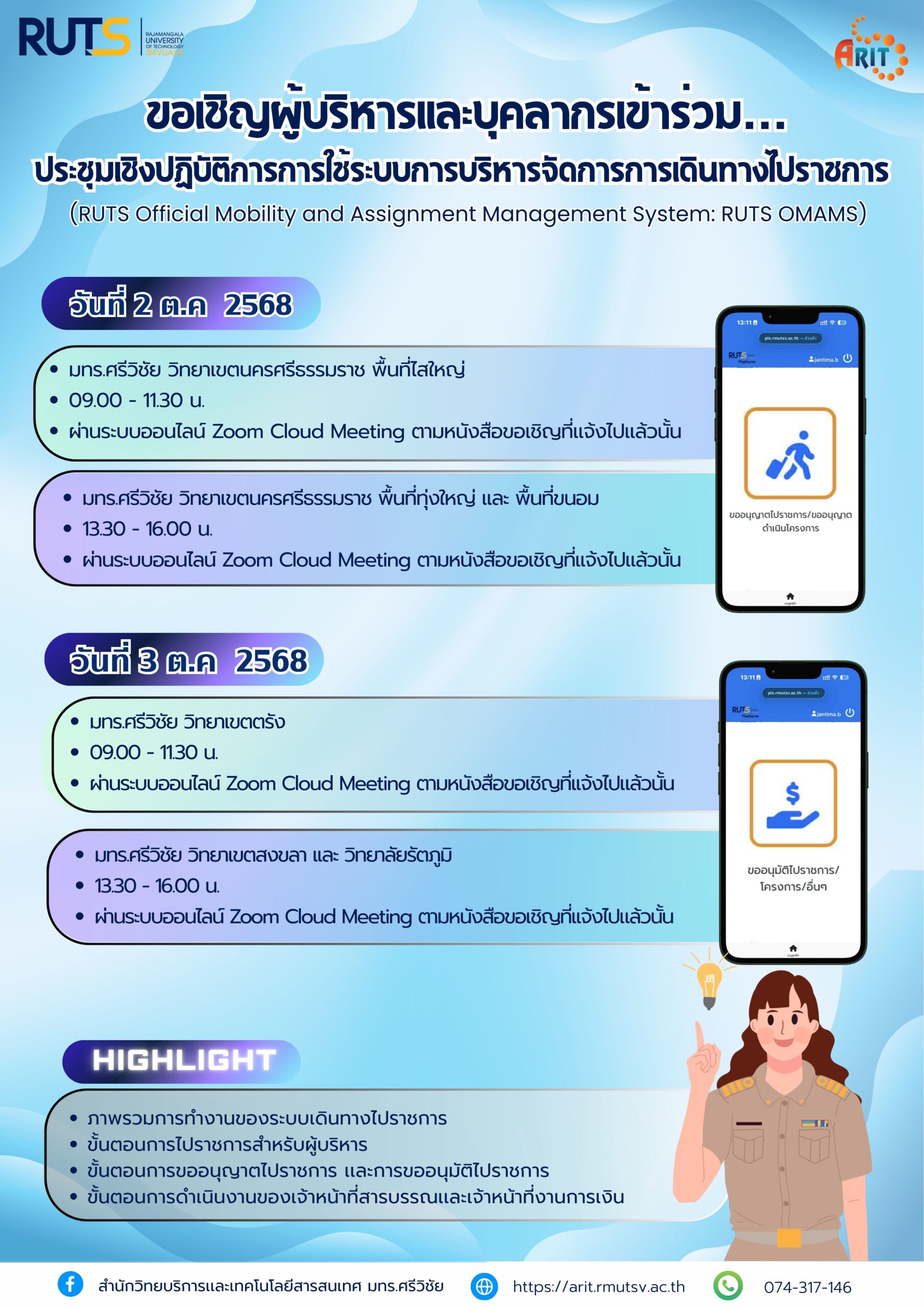 สำนักวิทยบริการและเทคโนโลยีสารสนเทศ มหาวิทยาลัยเทคโนโลยีราชมงคลศรีวิชัย ขอเชิญผู้บริหารและบุคลากรเข้าร่วมการประชุมเชิงปฏิบัติการ“การใช้ระบบการบริหารจัดการการเดินทางไปราชการ (RUTS OMAMS)