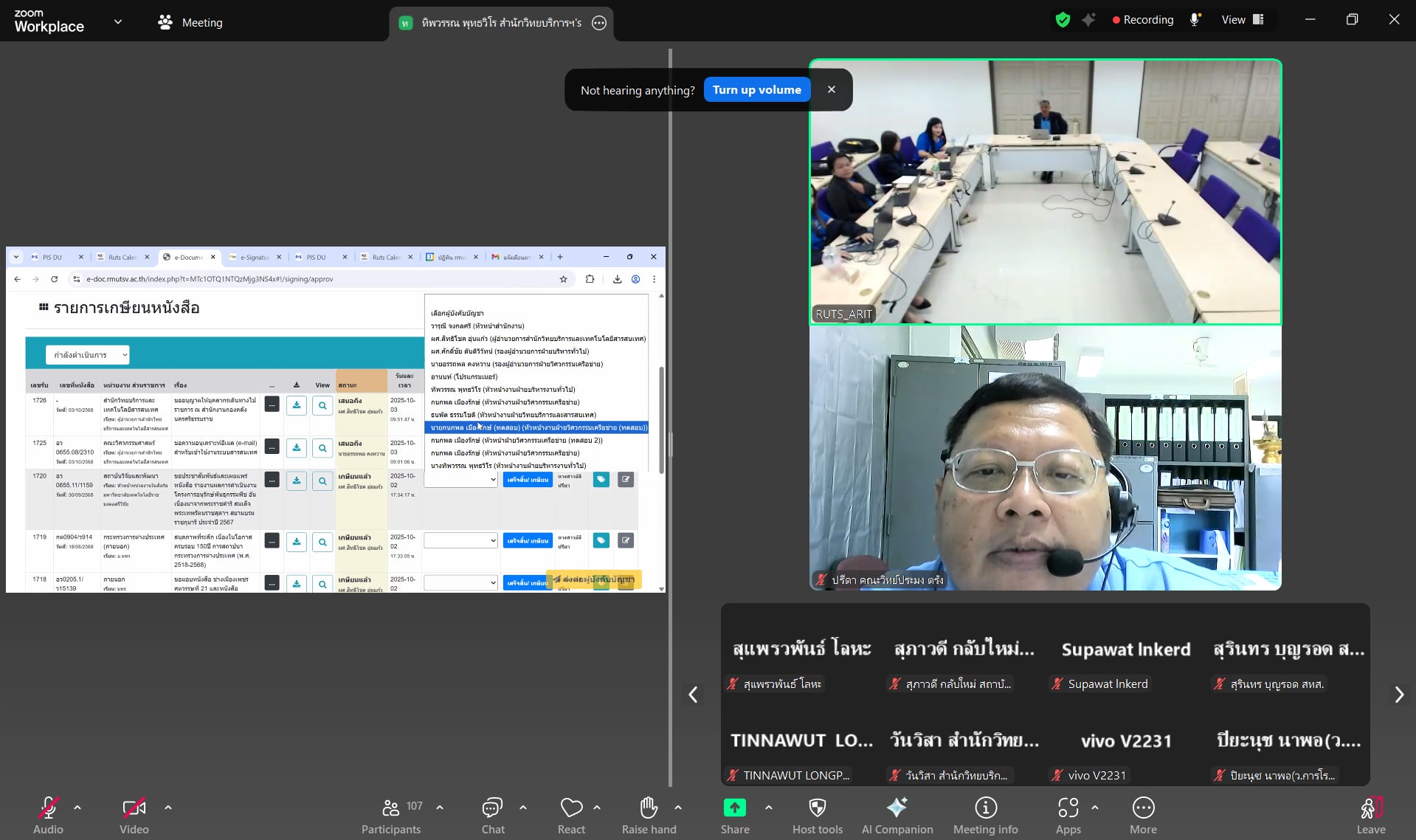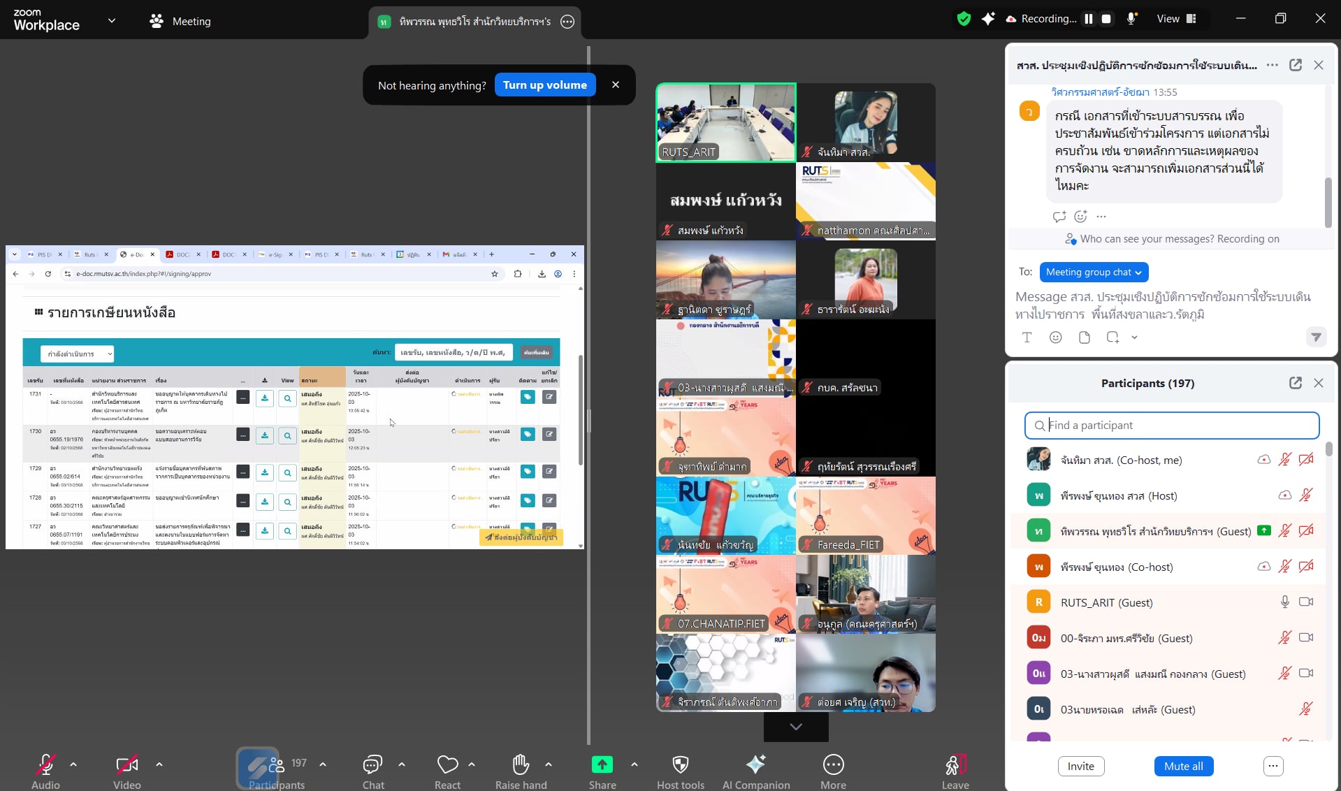 บรรยากาศการประชุมเต็มไปด้วยการแลกเปลี่ยนความคิดเห็น โดยผู้บริหารและบุคลากรได้ให้ข้อเสนอแนะเพื่อการพัฒนาระบบ อาทิ อาจารย์สถาพร ขุนเพชร รองอธิการบดี, ผู้ช่วยศาสตราจารย์ ดร.ขวัญหทัย ใจเปี่ยม รองอธิการบดีประจำวิทยาเขตนครศรีธรรมราช, ผู้ช่วยศาสตราจารย์สิทธิโชค จันทร์ย่อง รองอธิการบดีประจำวิทยาเขตตรัง, ว่าที่ร้อยตรีปรีชา มุณีศรี คณบดีคณะอุตสาหกรรมเกษตร รวมถึงหัวหน้าสำนักงานคณะต่าง ๆ หัวหน้างาน และบุคลากรผู้ปฏิบัติงาน