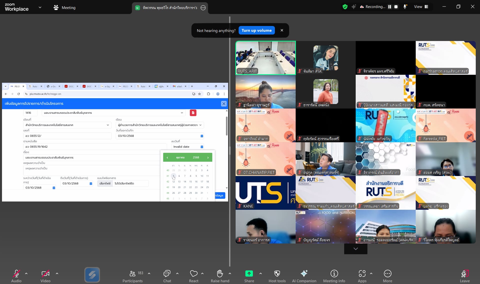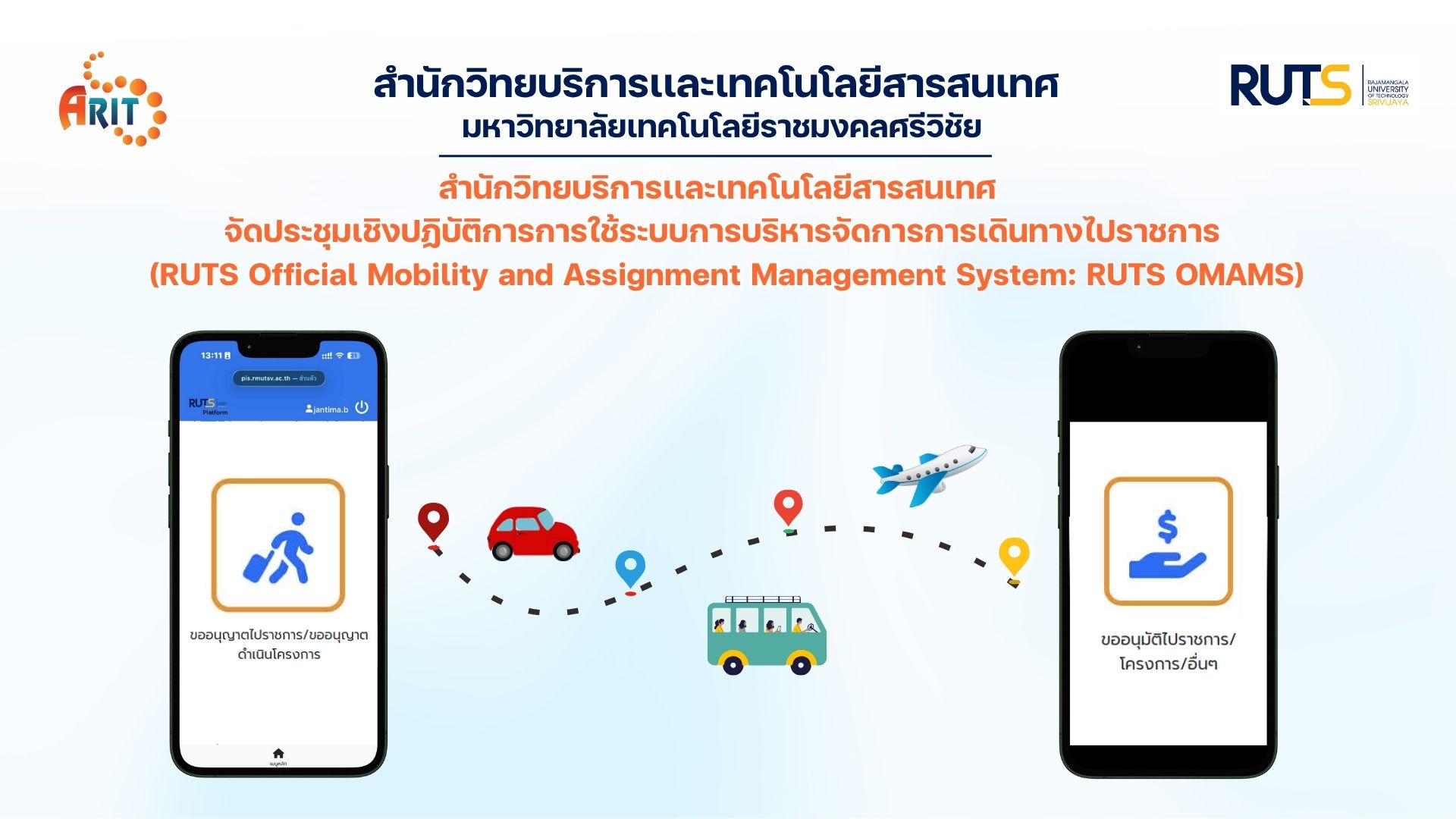 เมื่อวันที่ 2–3 ตุลาคม 2568 สำนักวิทยบริการและเทคโนโลยีสารสนเทศ ได้จัดประชุมเชิงปฏิบัติการการใช้ระบบการบริหารจัดการการเดินทางไปราชการ (RUTS Official Mobility and Assignment Management System : RUTS OMAMS) เพื่อเสริมสร้างความรู้ ความเข้าใจในการใช้งานระบบให้กับบุคลากรของมหาวิทยาลัย ซึ่งมหาวิทยาลัยได้มีการประกาศเเจ้งเปิดใช้งานระบบอย่างเป็นทางการ เมื่อวันที่ 1 ตุลาคม 2568 ที่ผ่านมา