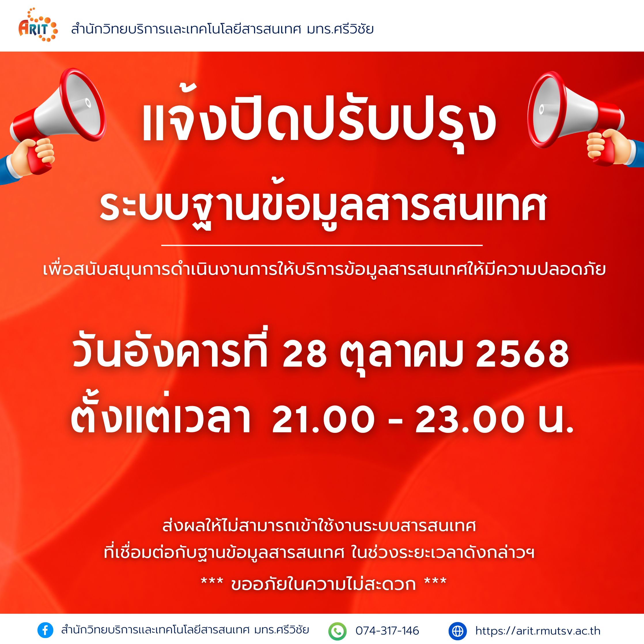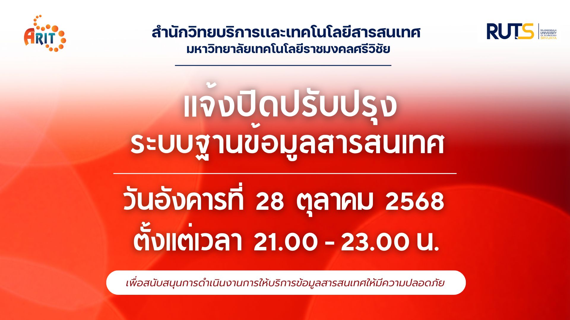 สำนักวิทยบริการเเละเทคโนโลยีสารสนเทศ เเจ้งปิดปรับปรุงระบบฐานข้อมูลสารสนเทศ เพื่อสนับสนุนการดำเนินงาน การให้บริการข้อมูล เเละการพัฒนาระบบสารสนเทศในภาพรวมให้มีความถูกต้อง ปลอดภัย เเละตอบสนองต่อความต้องการของหน่วยงานต่าง ๆ ได้อย่างมีประสิทธิภาพ โดยปิดปรับปรุง ในวันอังคารที่ ๒๘ ตุลาคม ๒๕๖๘ ตั้งแต่เวลา ๒๑.๐๐ – ๒๓.๐๐ น. ซึ่งส่งผลให้ไม่สามารถเข้าใช้งานระบบสารสนเทศที่เชื่อมต่อกับฐานข้อมูลสารสนเทศได้ในช่วงเวลาดังกล่าว