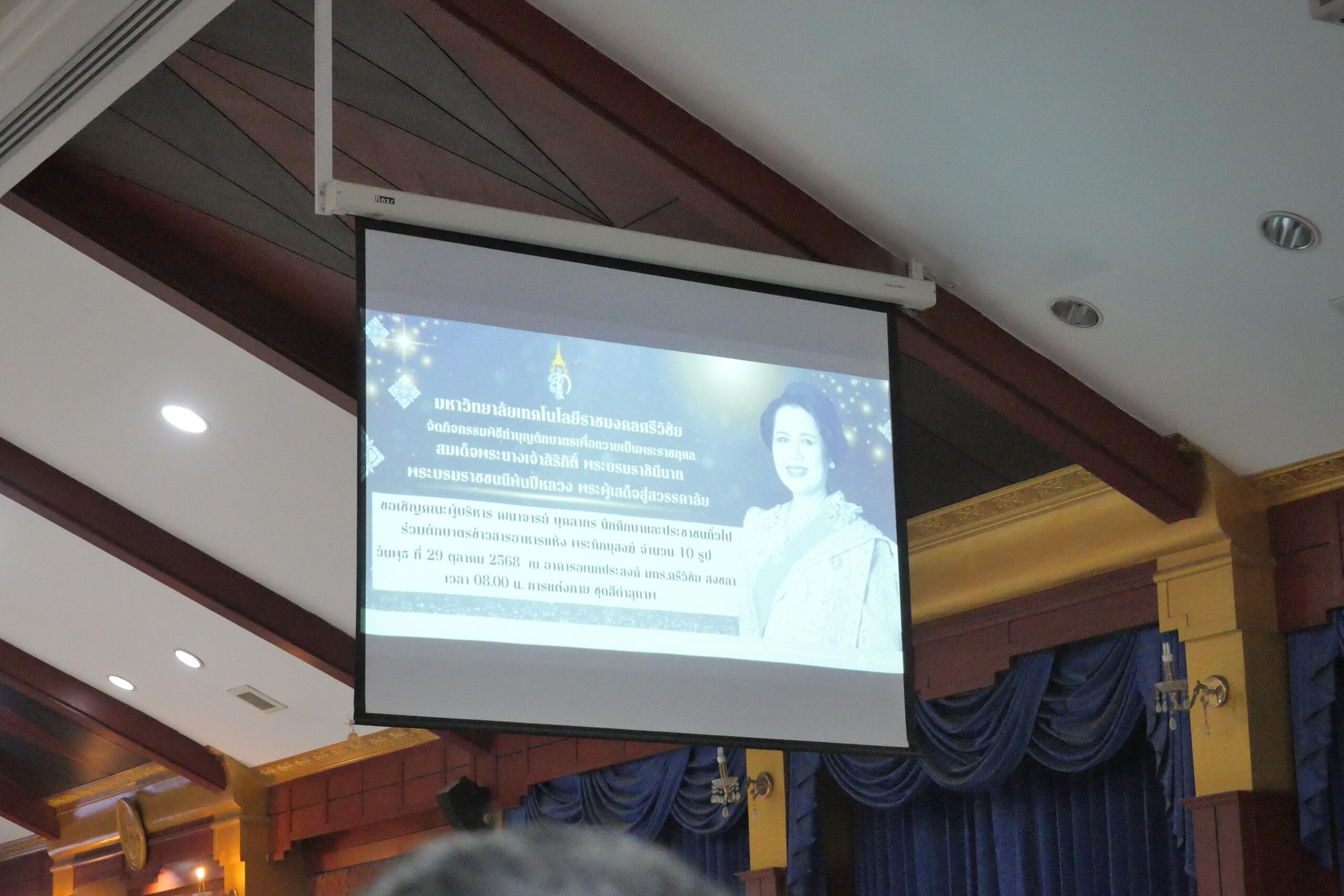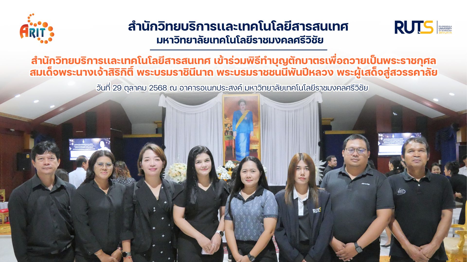 เมื่อวันที่ 29 ตุลาคม 2568 เวลา 08.00 น. สำนักวิทยบริการและเทคโนโลยีสารสนเทศ มหาวิทยาลัยเทคโนโลยีราชมงคลศรีวิชัย เข้าร่วมพิธีทำบุญตักบาตรข้าวสารอาหารแห้ง เพื่อถวายเป็นพระราชกุศลแด่ สมเด็จพระนางเจ้าสิริกิติ์ พระบรมราชินีนาถ พระบรมราชชนนีพันปีหลวง พระผู้เสด็จสู่สวรรคาลัย โดยมีการจัดพิธีขึ้น ณ อาคารอเนกประสงค์ มหาวิทยาลัยเทคโนโลยีราชมงคลศรีวิชัย อำเภอเมือง จังหวัดสงขลา ภายใต้การจัดงานของ สำนักงานอธิการบดี