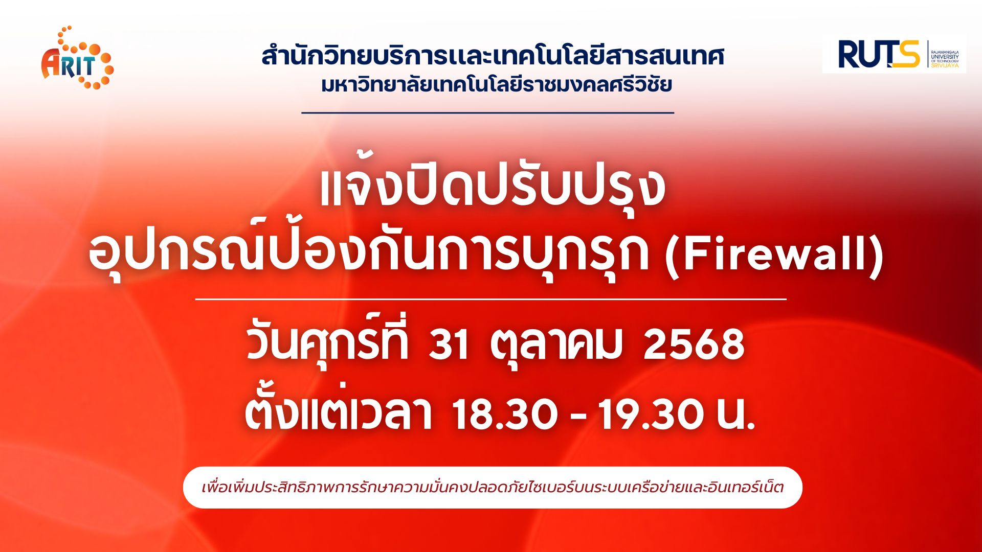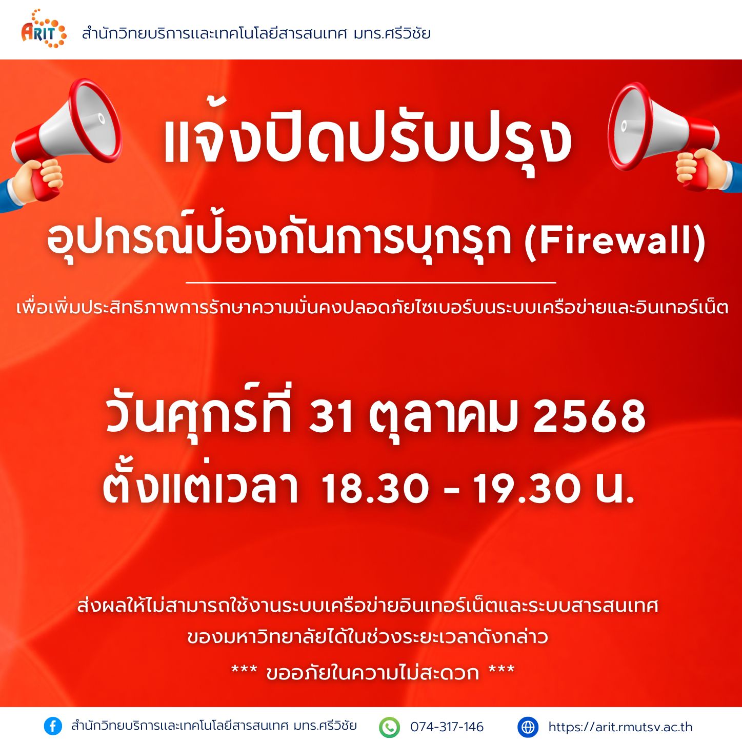 วันที่ 31 ตุลาคม 2568 เวลา 18.30 – 19.30 น. สำนักวิทยบริการเเละเทคโนโลยีสารสนเทศ เเจ้งปิดปรับปรุงอุปกรณ์ป้องกันการบุกรุก (Firewall) เพื่อเพิ่มประสิทธิภาพการรักษาความมั่นคงปลอดภัยไซเบอร์บนระบบเครือข่ายและอินเทอร์เน็ต ส่งผลให้ไม่สามารถใช้งานระบบเครือข่ายอินเทอร์เน็ตและระบบสารสนเทศของมหาวิทยาลัยได้