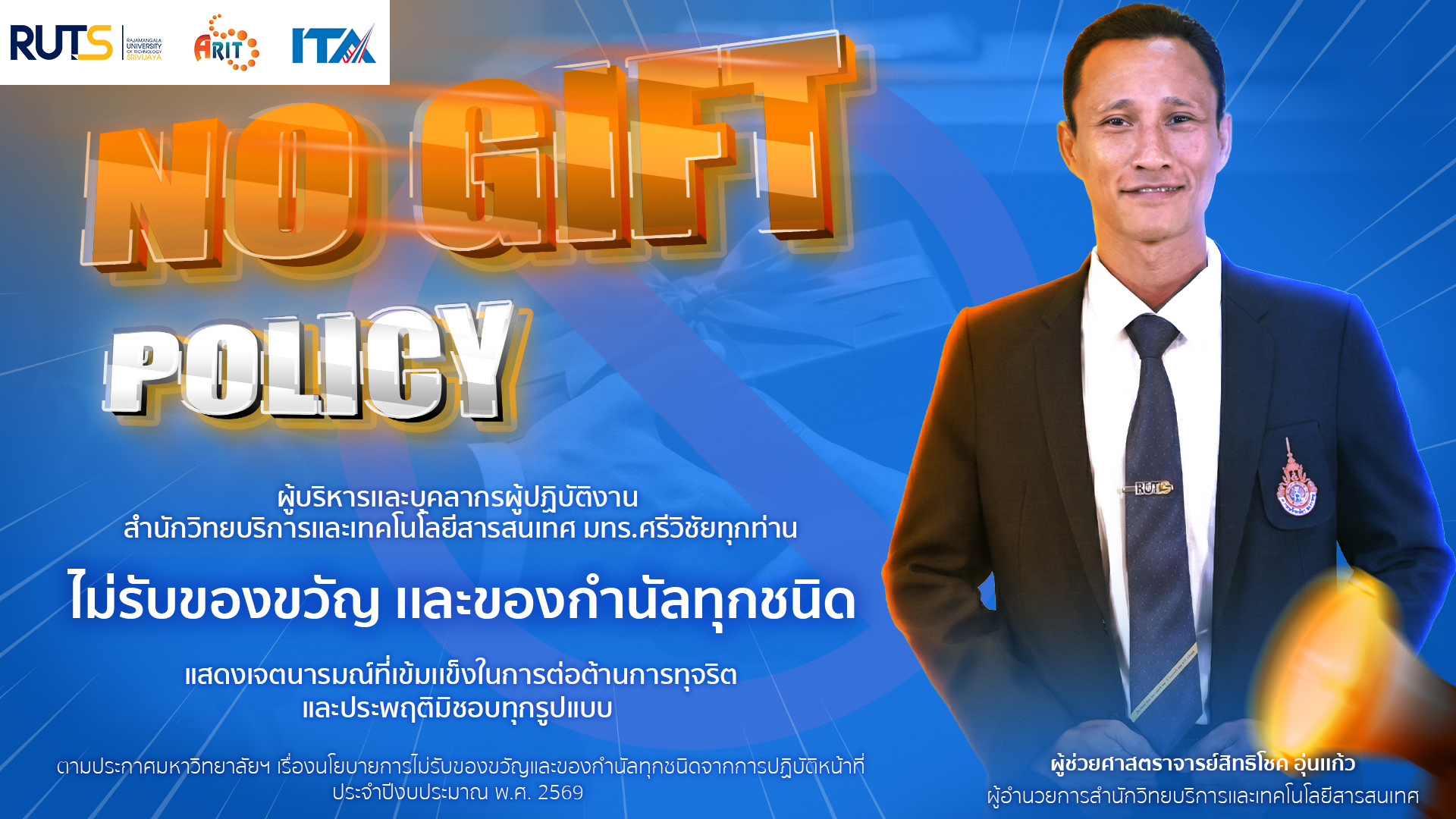 โดยสำนักวิทยบริการและเทคโนโลยีสารสนเทศ ได้ถือปฏิบัติตามนโยบายอย่างเคร่งครัด โดยไม่รับของขวัญหรือของกำนัลทุกชนิดจากการปฏิบัติหน้าที่แต่อย่างใด ซึ่งเป็นไปตามแบบฟอร์มรายงานการรับของขวัญและของกำนัลตามนโยบาย No Gift Policy