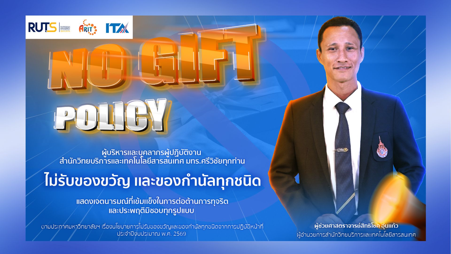 โดยสำนักวิทยบริการและเทคโนโลยีสารสนเทศ ได้ถือปฏิบัติตามนโยบายอย่างเคร่งครัด โดยไม่รับของขวัญหรือของกำนัลทุกชนิดจากการปฏิบัติหน้าที่แต่อย่างใด ซึ่งเป็นไปตามแบบฟอร์มรายงานการรับของขวัญและของกำนัลตามนโยบาย No Gift Policy