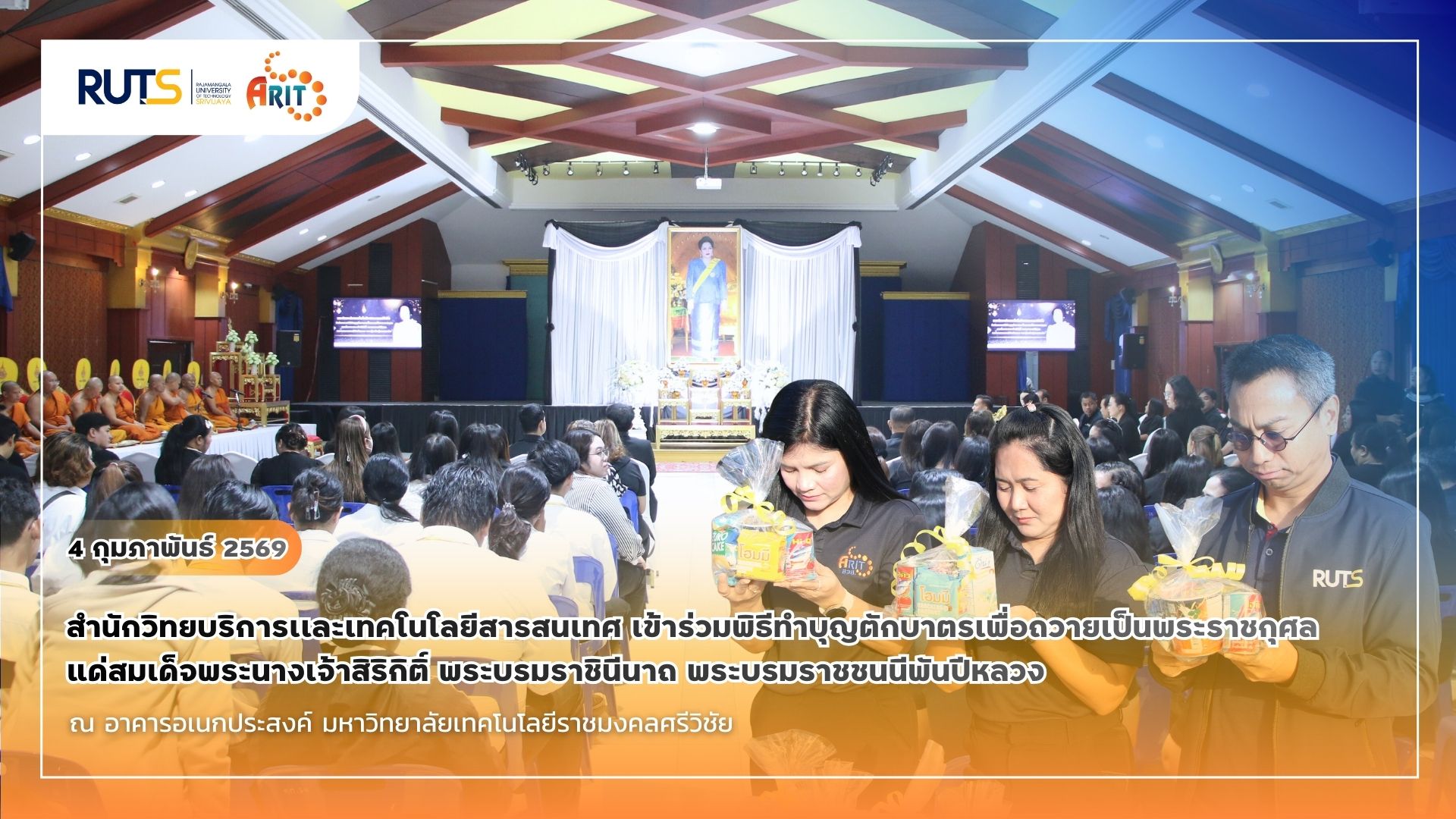 วันที่ 4 กุมภาพันธ์ 2568 เวลา 07.45 น. สำนักวิทยบริการและเทคโนโลยีสารสนเทศ มหาวิทยาลัยเทคโนโลยีราชมงคลศรีวิชัย เข้าร่วมพิธีทำบุญตักบาตรถวายเป็นพระราชกุศลแด่ สมเด็จพระนางเจ้าสิริกิติ์ พระบรมราชินีนาถ พระบรมราชชนนีพันปีหลวง พระผู้เสด็จสู่สวรรคาลัย โดยมีการจัดพิธีขึ้น ณ อาคารอเนกประสงค์ มหาวิทยาลัยเทคโนโลยีราชมงคลศรีวิชัย อำเภอเมือง จังหวัดสงขลา ภายใต้การจัดงานของ สำนักงานอธิการบดี