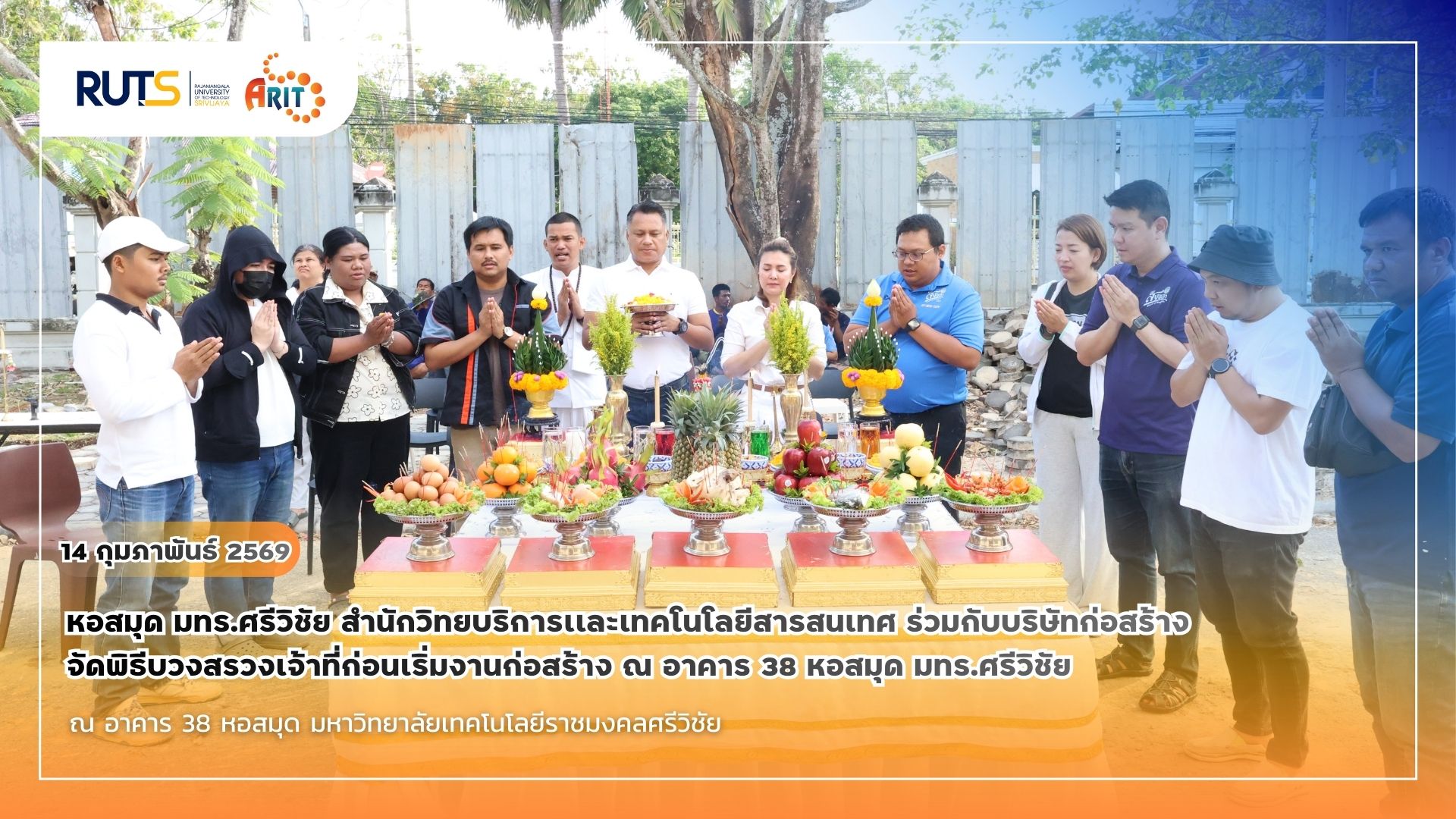 วันที่ 14 กุมภาพันธ์ 2569 เวลา 08.09 น. หอสมุดมหาวิทยาลัยเทคโนโลยีราชมงคลศรีวิชัย สำนักวิทยบริการและเทคโนโลยีสารสนเทศ ร่วมกับบริษัทก่อสร้าง จัดพิธีบวงสรวงเจ้าที่ ณ อาคาร 38 หอสมุด เพื่อความเป็นสิริมงคลก่อนเริ่มดำเนินงานก่อสร้าง และเพื่อให้การดำเนินงานเป็นไปด้วยความเรียบร้อย ราบรื่น และสำเร็จตามแผนงานที่กำหนด