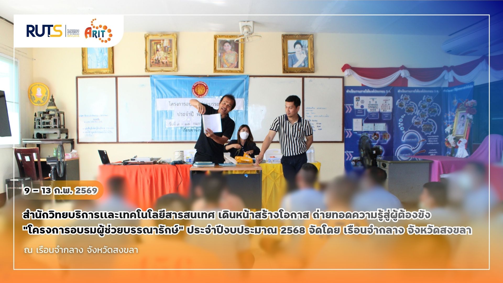 ระหว่างวันที่ 9–13 กุมภาพันธ์ 2569 สำนักวิทยบริการและเทคโนโลยีสารสนเทศ มหาวิทยาลัยเทคโนโลยีราชมงคลศรีวิชัย ได้เข้าร่วมบรรยายให้ความรู้แก่ผู้ต้องขัง ณ เรือนจำจังหวัดสงขลา