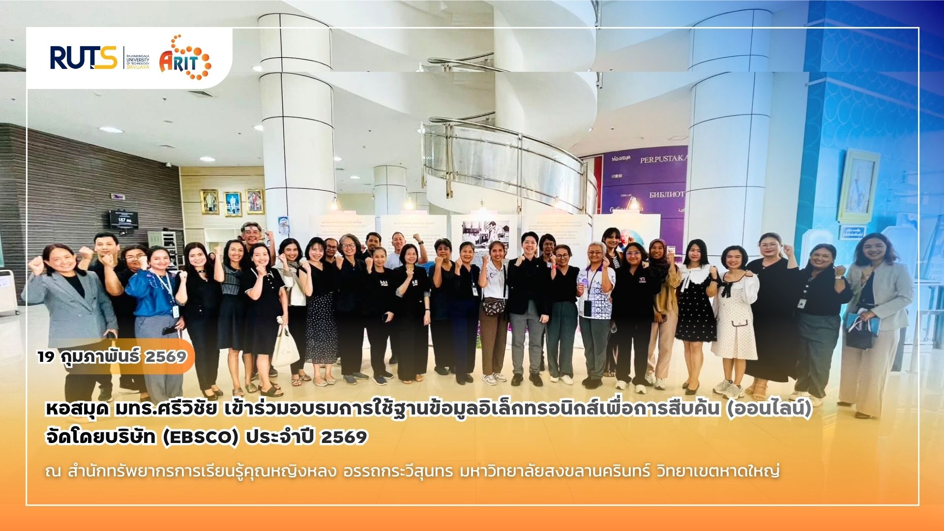 เมื่อวันที่ 19 กุมภาพันธ์ 2569 เวลา 09.00 – 16.30 น. หอสมุด มทร.ศรีวิชัย เข้าร่วมอบรมการใช้ฐานข้อมูลอิเล็กทรอนิกส์เพื่อการสืบค้น (ออนไลน์) โดยบริษัท EBSCO ประจำปี 2569 ณ สำนักทรัพยากรการเรียนรู้คุณหญิงหลง อรรถกระวีสุนทร มหาวิทยาลัยสงขลานครินทร์ วิทยาเขตหาดใหญ่