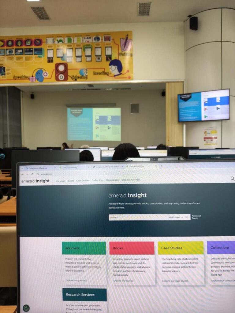 เเละในภาคบ่ายจะเป็นการอบรมการใช้ฐานข้อมูล Emerald Management ซึ่งเป็นฐานข้อมูลวารสารวิชาการ/บทความฉบับเต็ม ที่เน้นด้าน บริหารธุรกิจและการจัดการ เป็นหลัก เช่น กลยุทธ์ องค์กร ภาวะผู้นำ การตลาด บัญชี-การเงิน-เศรษฐศาสตร์ ทรัพยากรมนุษย์ โลจิสติกส์/ปฏิบัติการ คุณภาพ การท่องเที่ยวและการบริการ ภาครัฐและสิ่งแวดล้อม รวมถึงหัวข้อด้านสารสนเทศและการจัดการความรู้
