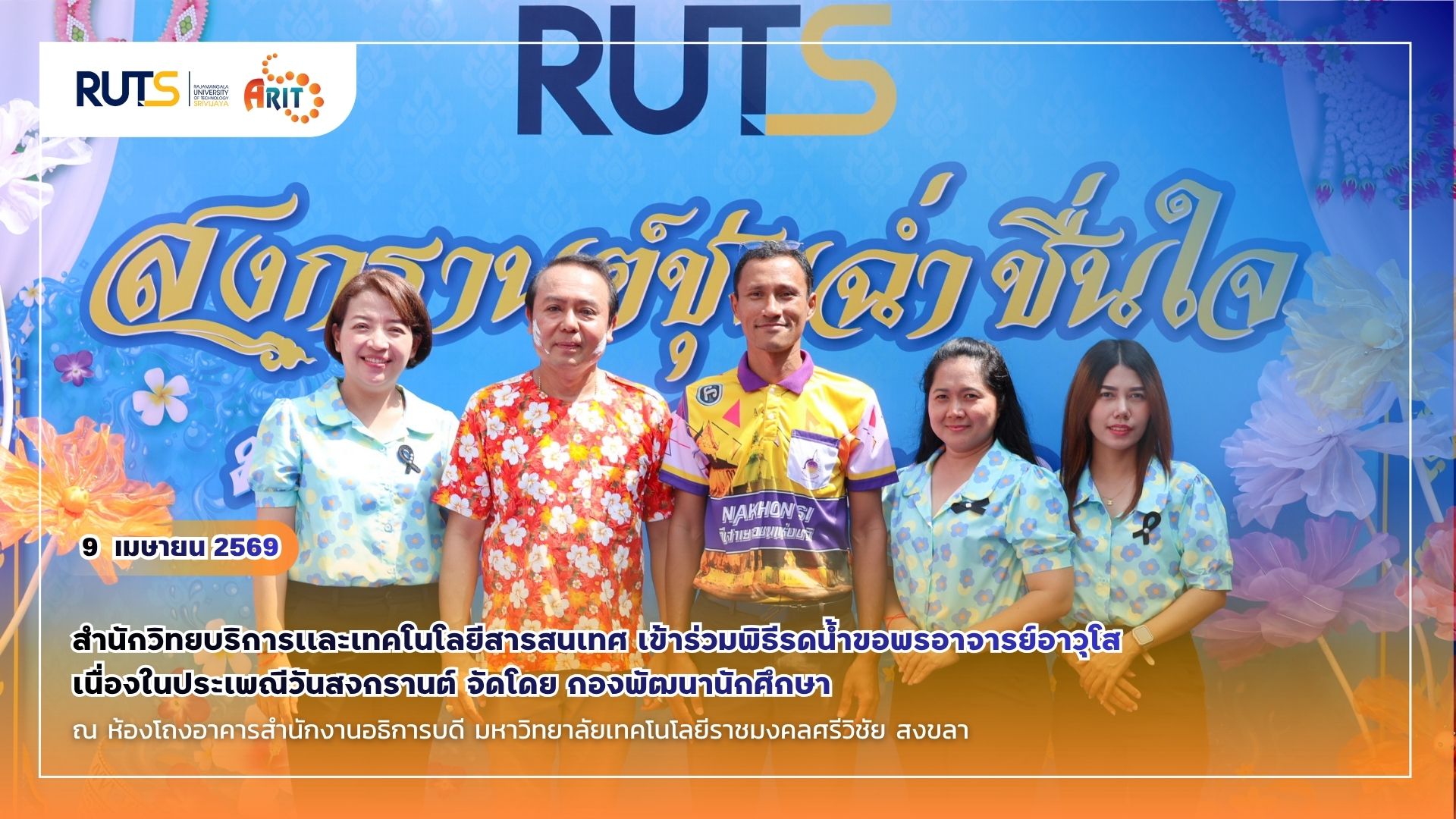 เมื่อวันที่ 9 เมษายน 2569 เวลา 09.00 น. สำนักวิทยบริการเเละเทคโนโลยีสารสนเทศ เข้าร่วมพิธีรดน้ำขอพรอาจารย์อาวุโส เนื่องในประเพณีวันสงกรานต์ จัดโดย กองพัฒนานักศึกษา