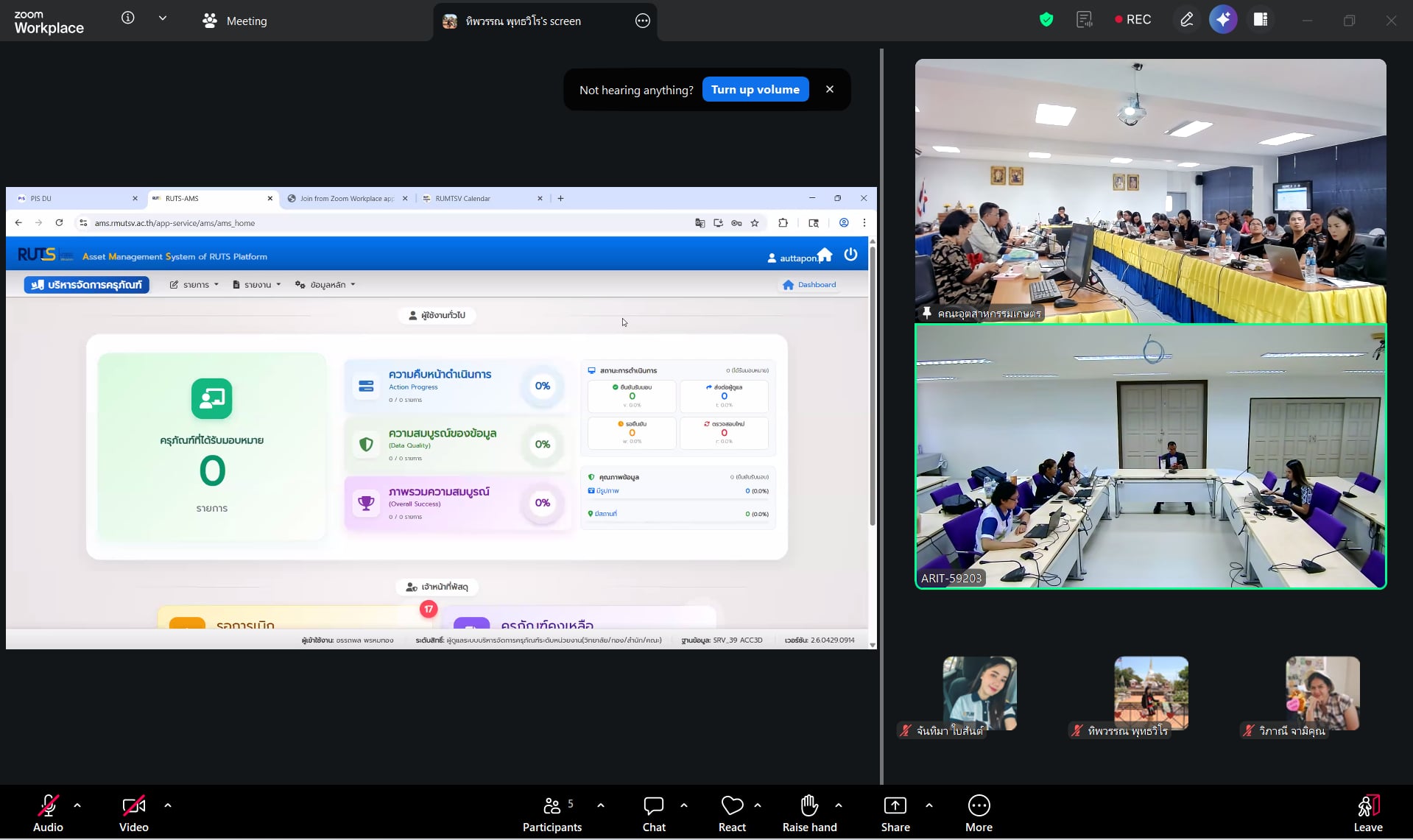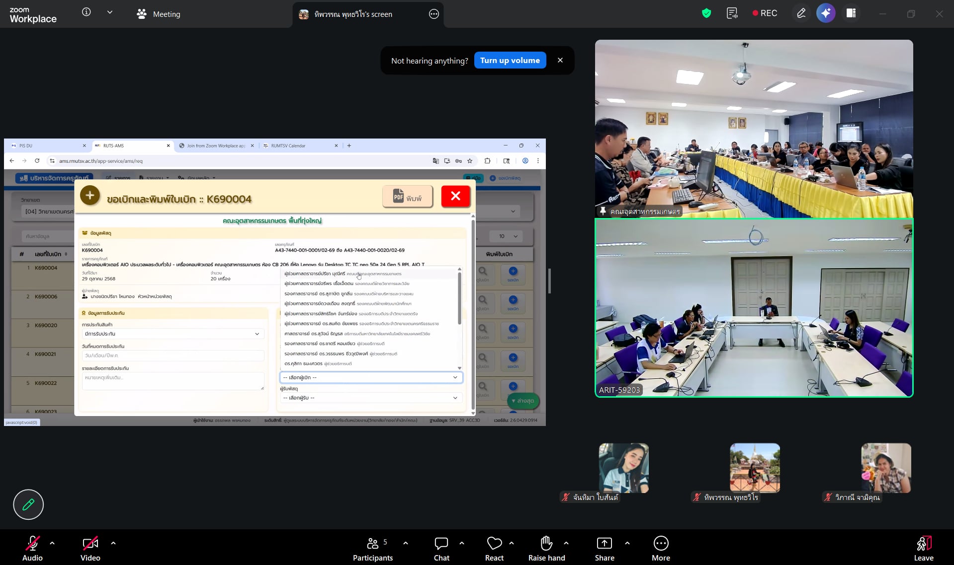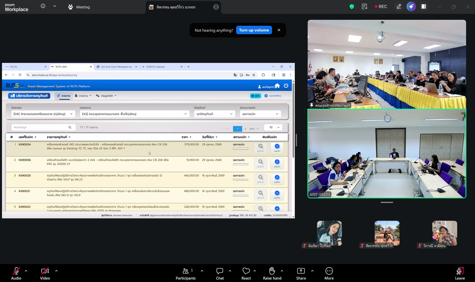 มอบหมายให้ นางวิภาณี สุขเอียด (เจ้าหน้าที่การเงินเเละบัญชี) ผู้ปฏิบัติงานพัสดุสำนักวิทยบริการฯ นางทิพวรรณ พุทธวิโร (หัวหน้าฝ่ายบริหารงานทั่วไป) ควบคุมดูเเลงานพัสดุ เเละนายสยาม จันทาพูน ผู้พัฒนาระบบ เป็นผู้ถ่ายทอดความรู้ แนะนำขั้นตอนการใช้งานระบบ และตอบข้อซักถามจากผู้เข้าร่วมประชุม เเละบุคลากรผู้รับผิดชอบงานด้านครุภัณฑ์ของคณะอุตสาหกรรมเกษตร นำโดย ณะอุตสาหกรรมเกษตร นำโดย ผศ.ว่าที่ร้อยตรี ปรีชา มุณีศรี คณบดีคณะอุตสาหกรรมเกษตร เเละบุคลากรที่เกี่ยวข้อง