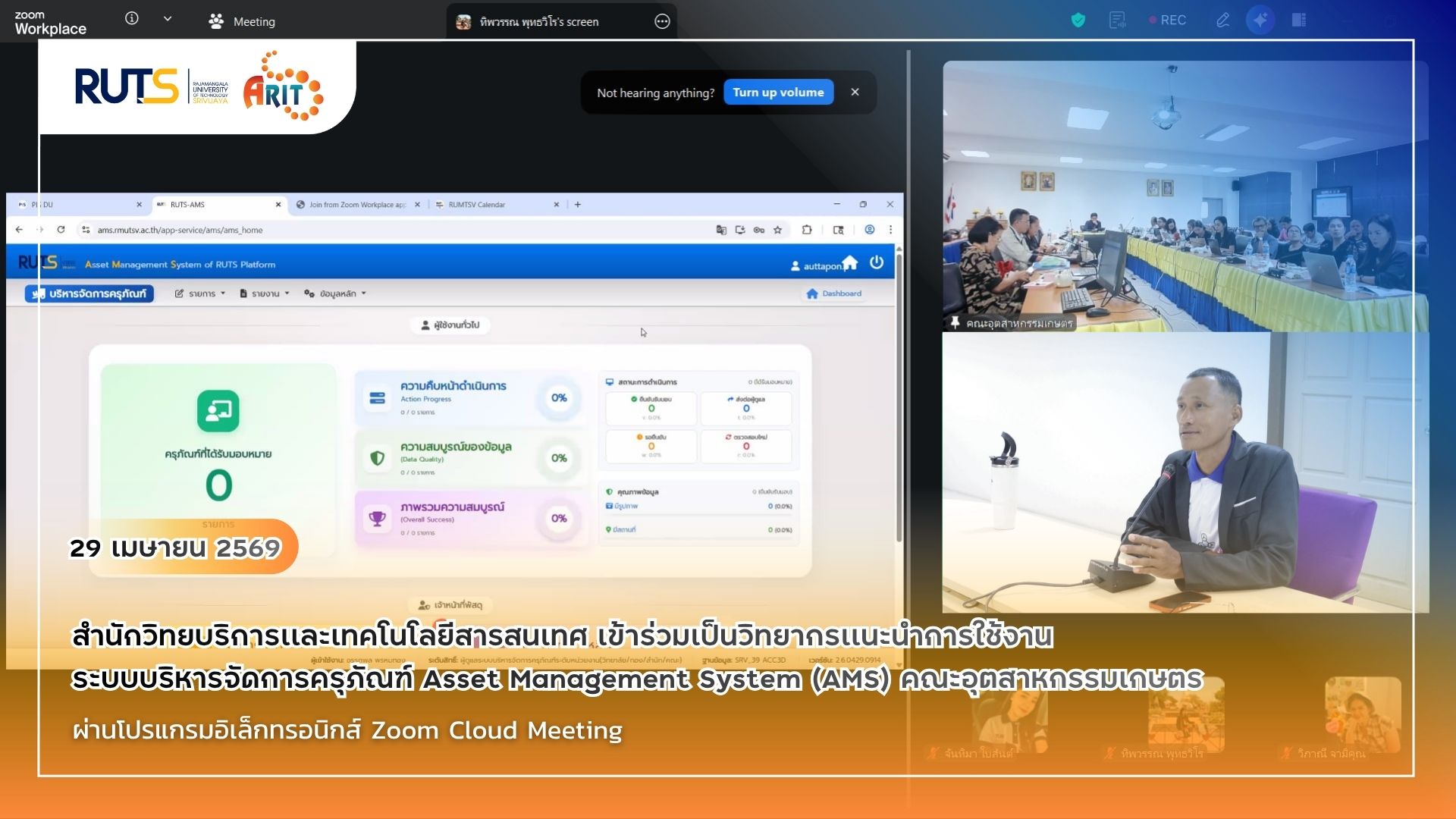 วันที่ 29 เมษายน 2569 เวลา 10.00 – 11.30 น. สำนักวิทยบริการและเทคโนโลยีสารสนเทศ มหาวิทยาลัยเทคโนโลยีราชมงคลศรีวิชัย เข้าร่วมเป็นวิทยากรแนะนำการใช้งานระบบบริหารจัดการครุภัณฑ์ Asset Management System (AMS) ให้แก่บุคลากรคณะอุตสาหกรรมเกษตร เพื่อสร้างความรู้ความเข้าใจเกี่ยวกับการใช้งานระบบ และส่งเสริมการบริหารจัดการข้อมูลครุภัณฑ์ให้มีความถูกต้อง เป็นปัจจุบัน และสามารถนำไปใช้ประโยชน์ในการปฏิบัติงานได้อย่างมีประสิทธิภาพ